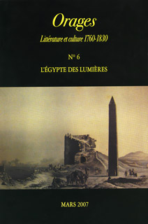 Les approches de ce mythe au XVIIIe et au début du XIXe siècles étant des plus diverses, ce numéro se veut interdisciplinaire. Daniel Lançon traite ainsi du contraste de l’Égypte de Savary avec celle de Volney. Marie Breguet y voit une source d’inspiration pour le poète Roucher, et François Rosset l’origine d’une philosophie du voyage chez Jean Potocki. L’éloge du chat égyptien par Moncrif occupe Jacques Berchtold, tandis que le culte des animaux sacrés, analysé par Sadek Neaimi, permet un débat sur la superstition et le divin. François Jacob évoque dans la tragédie de Marmontel la figure de Cléopâtre, en déclin au XVIIIe siècle. Christophe Paillard aborde enfin, à travers les mémoires de Tott, les éléments stratégiques de la vision de l’Égypte en France à l’aube de la Révolution. Suivent des extraits des carnets inédits du drogman Jean-Baptiste Adanson ainsi que quelques descriptions d’Alexandrie extraites des ouvrages de Lucas, Volney, Savary et Vivant Denon — sans oublier le traditionnel «cahier» d’Orages, en compagnie cette année de Jean-Noël Pascal et d’Hervé Loichemol.